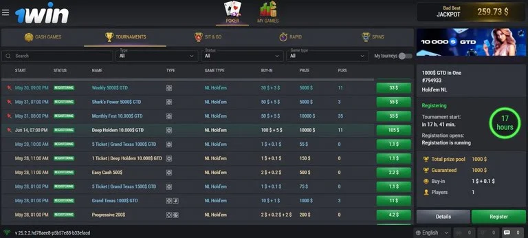 1Win 포커는 2016년부터 전 세계 플레이어들에게 흥미로운 게임 경험과 다양한 보상을 제공하는 온라인 포커 플랫폼입니다. 초보자부터 숙련자까지 모두 즐길 수 있는 환경을 제공합니다.